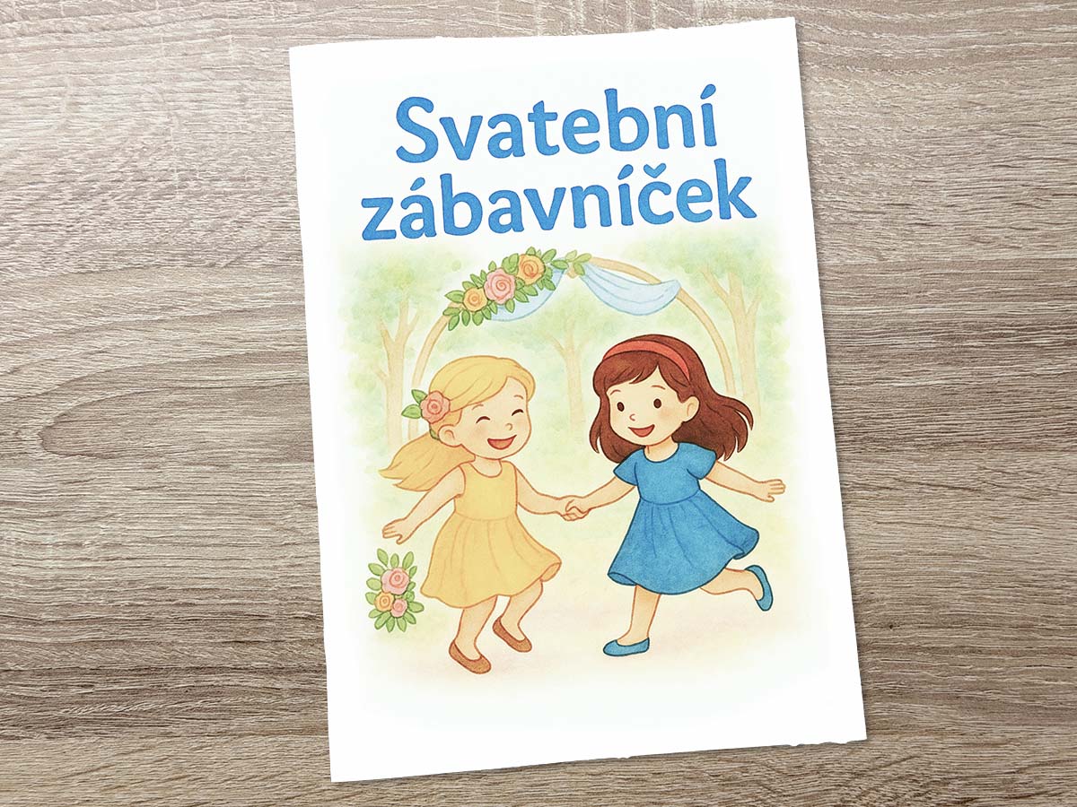 Svatební omalovánky pro děti – zábavníček (A5) s 15 stranami omalovánek, her a úkolů, které zabaví malé svatebčany během hostiny i večerní zábavy.
